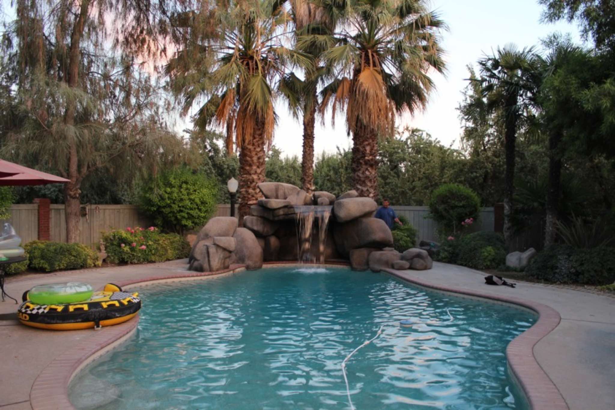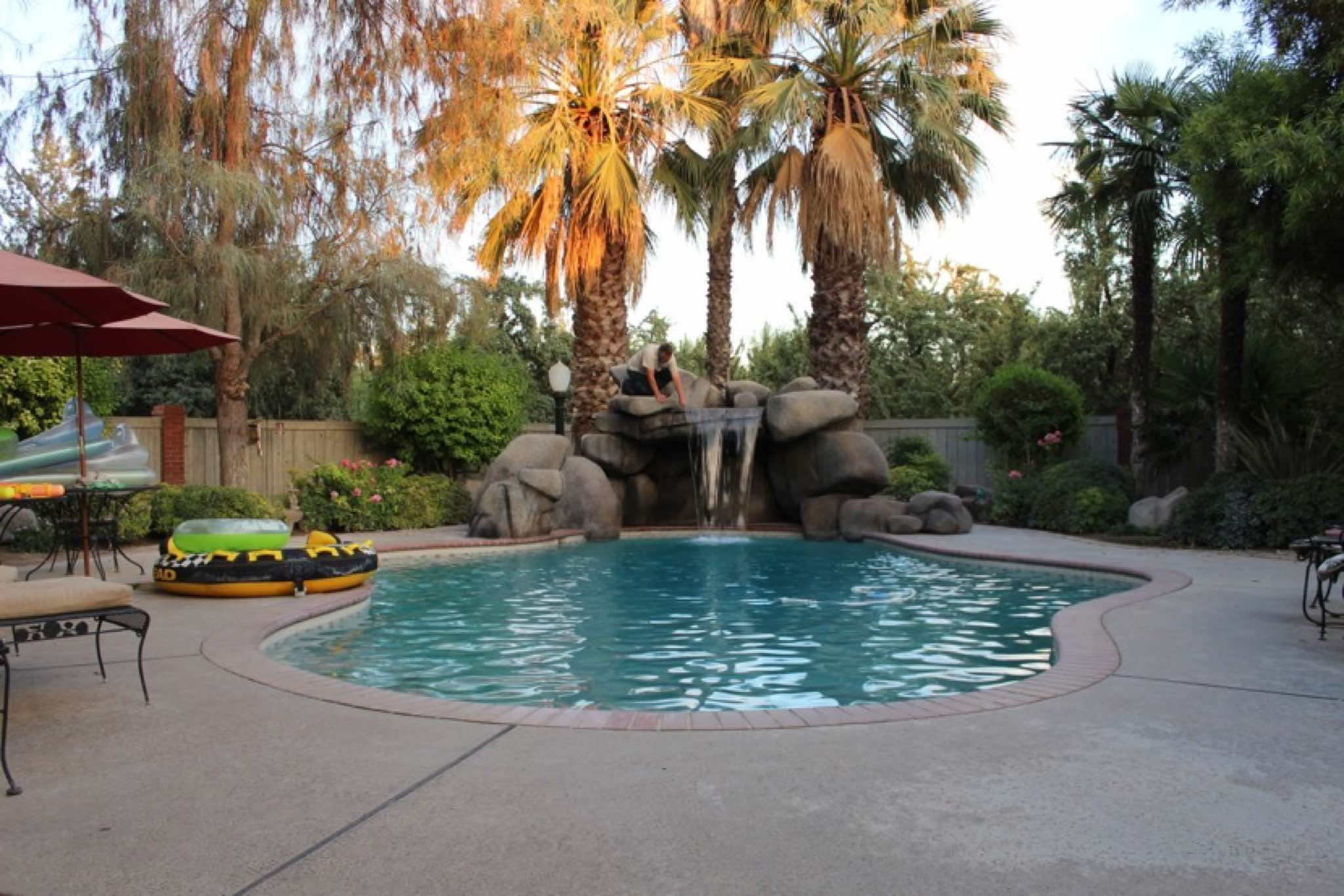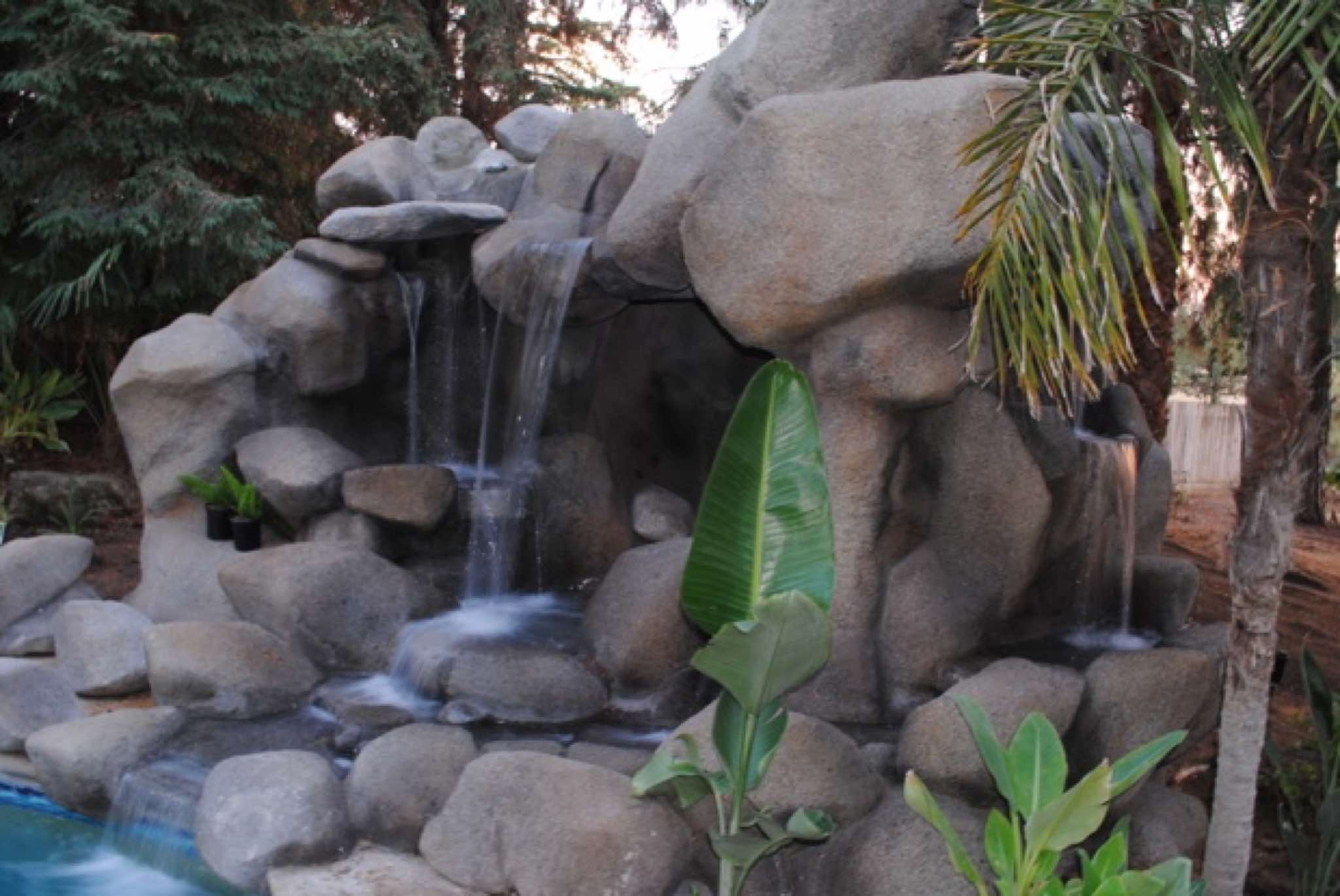 This is a very large pool waterfall build for a customer outside of Kerman. It features built in steps on the back to climb up and dive off of the main spillway and a large grotto area in the middle to sit in behind the falling water. We also installed a diving boulder to the left of the waterfall.