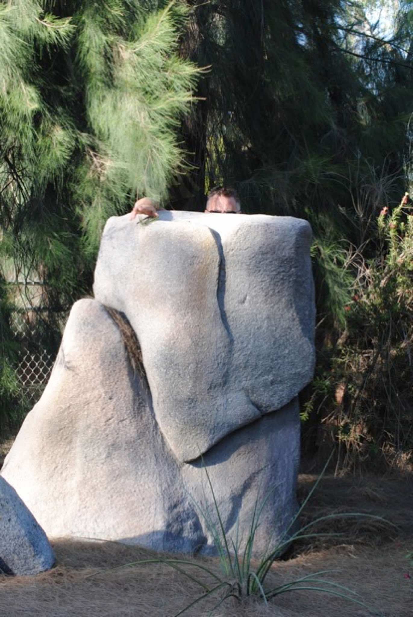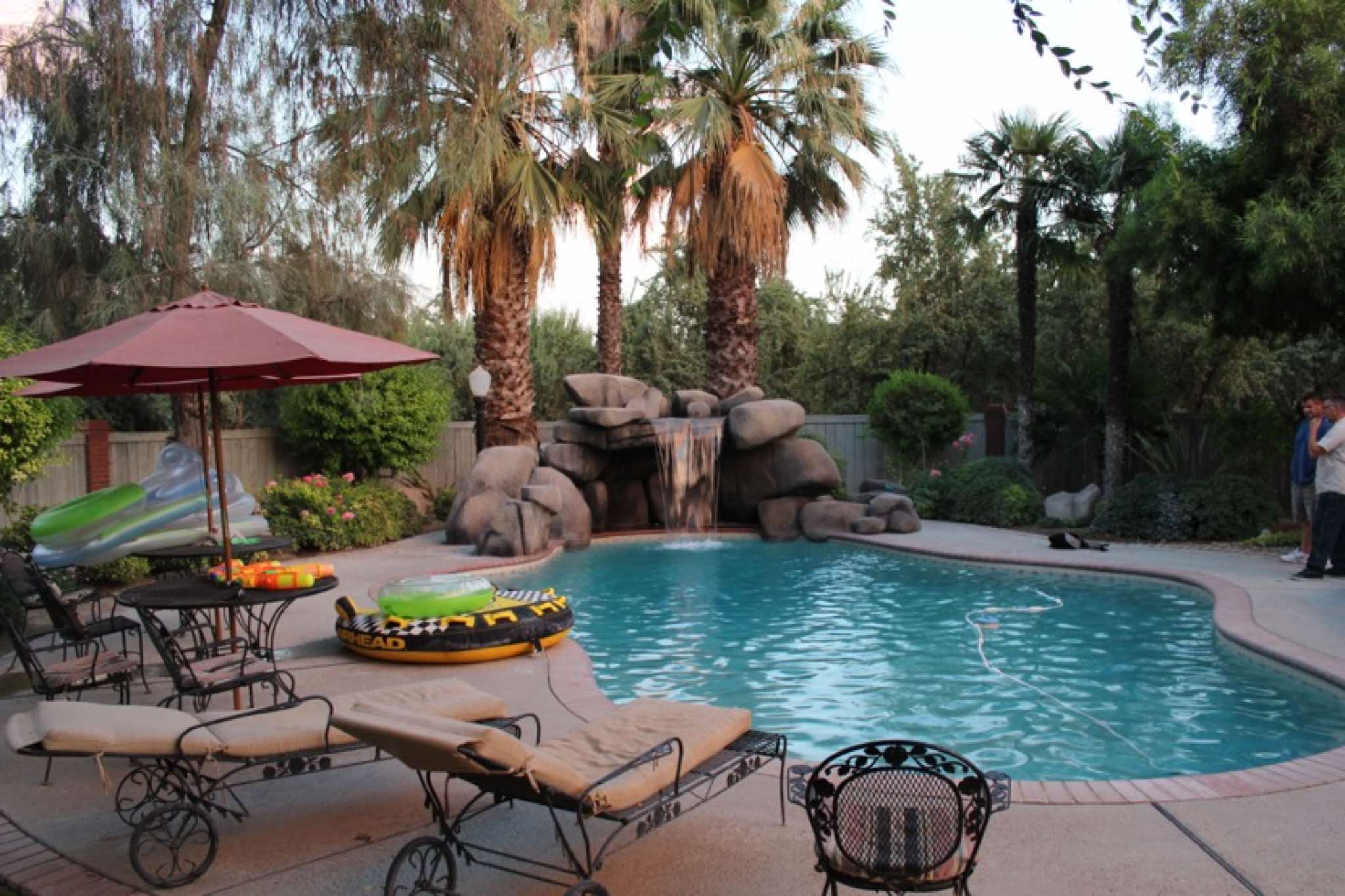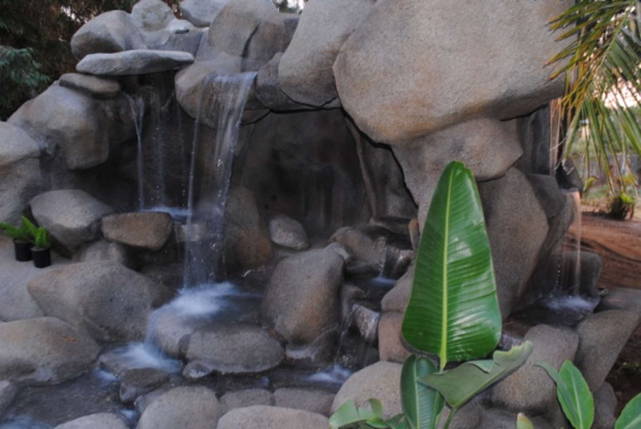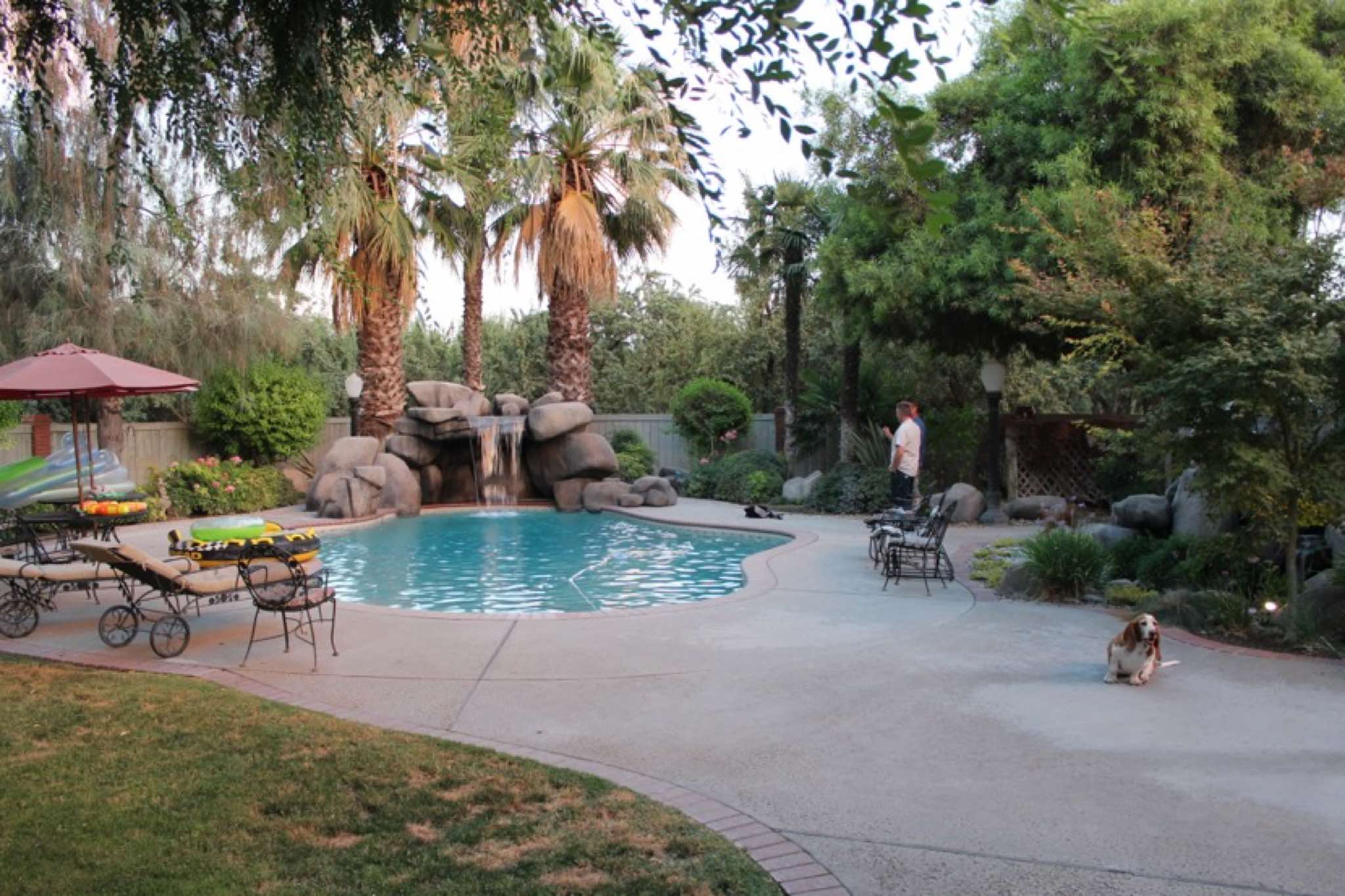 This is a very large pool waterfall build for a customer outside of Kerman. It features built in steps on the back to climb up and dive off of the main spillway and a large grotto area in the middle to sit in behind the falling water. We also installed a diving boulder to the left of the waterfall.