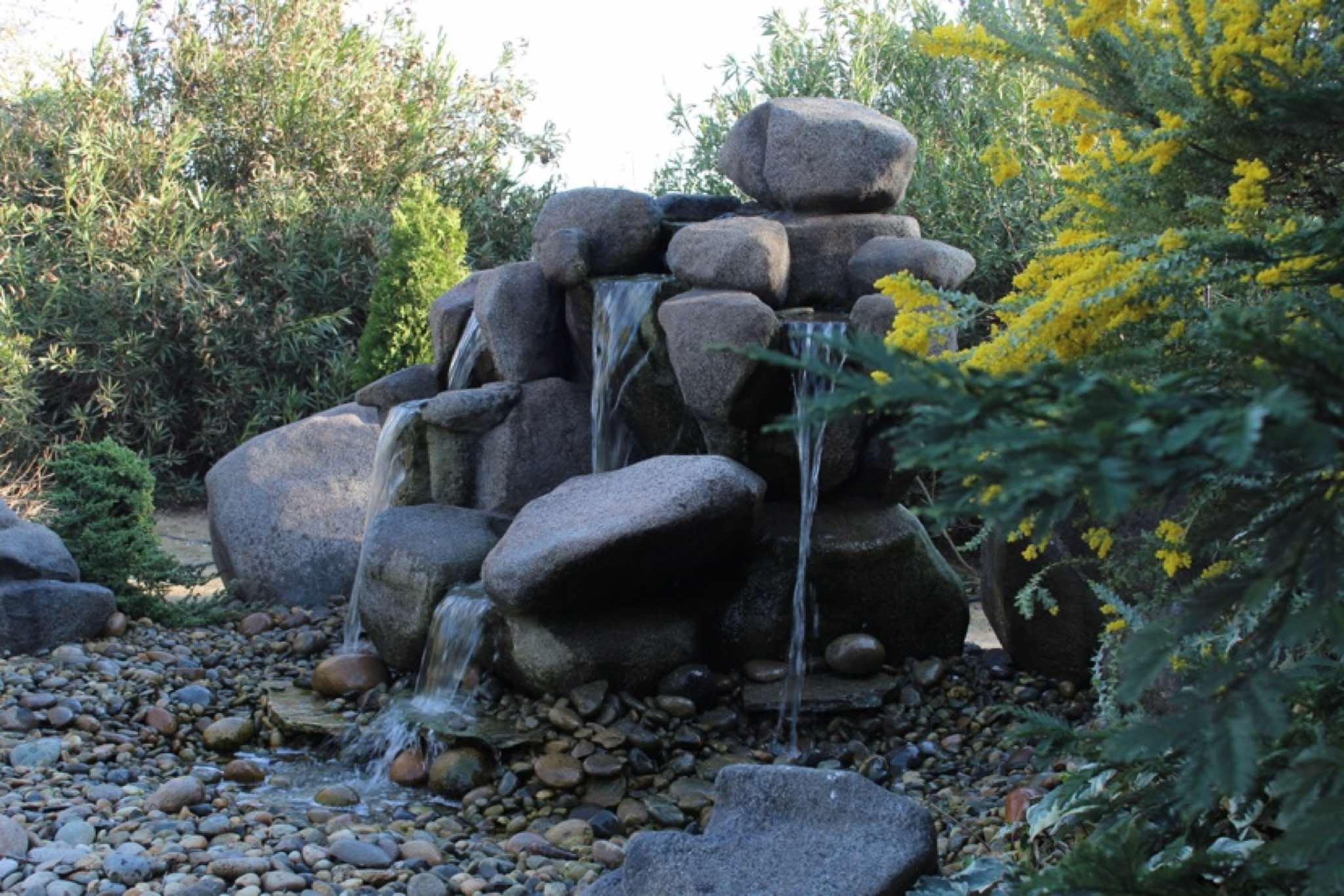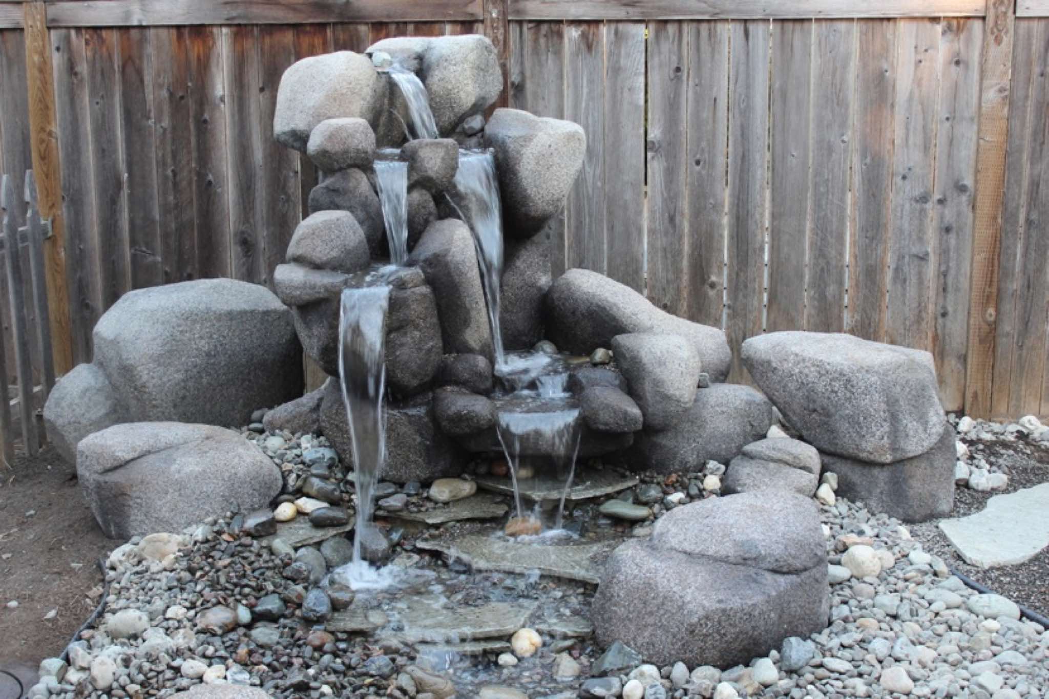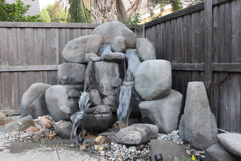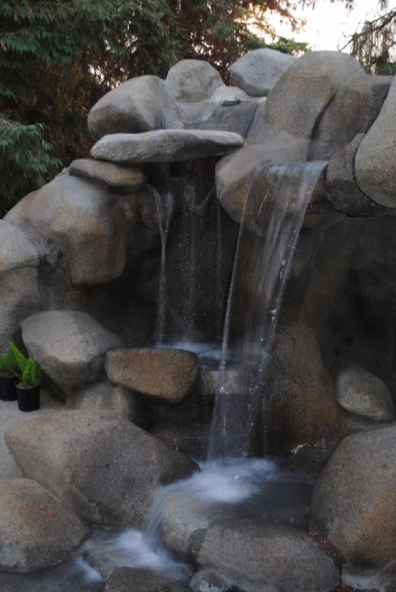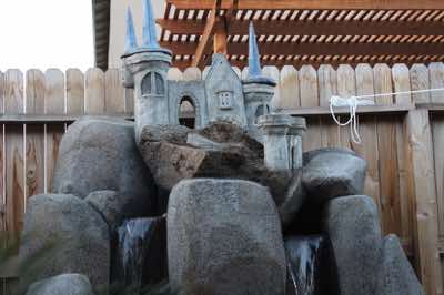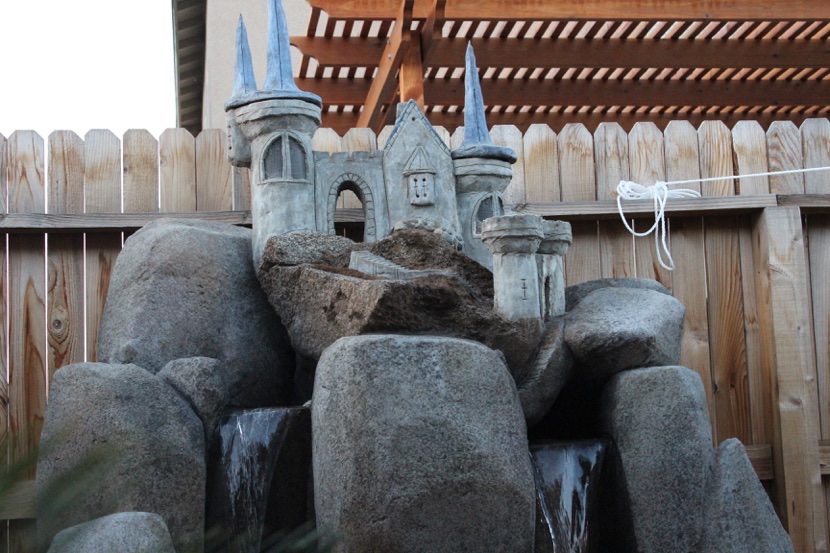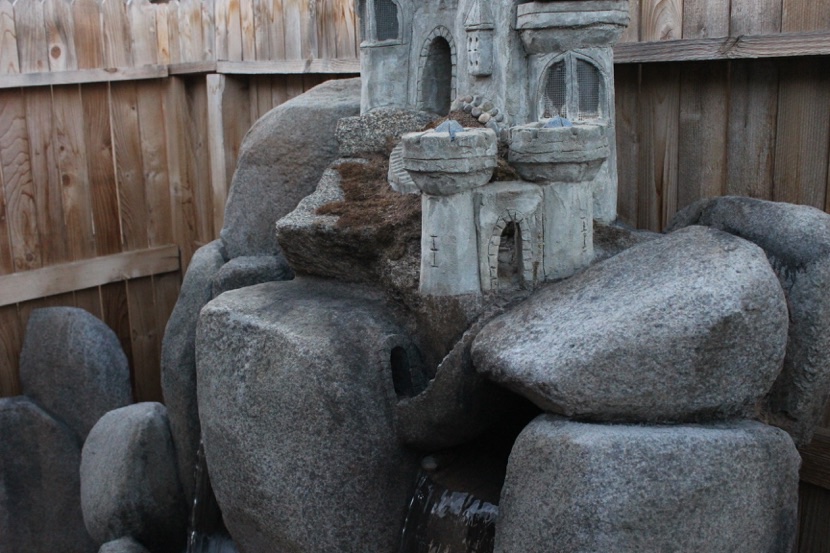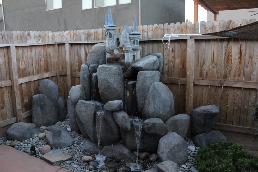 This pondless waterfall was built featuring a castle that the customer had owned for years. The granite boulder the castle was built upon was seamlessly integrated into the foe rock of the waterfall. Low voltage lighting was added to the castle towers to illuminate them in the evenings.