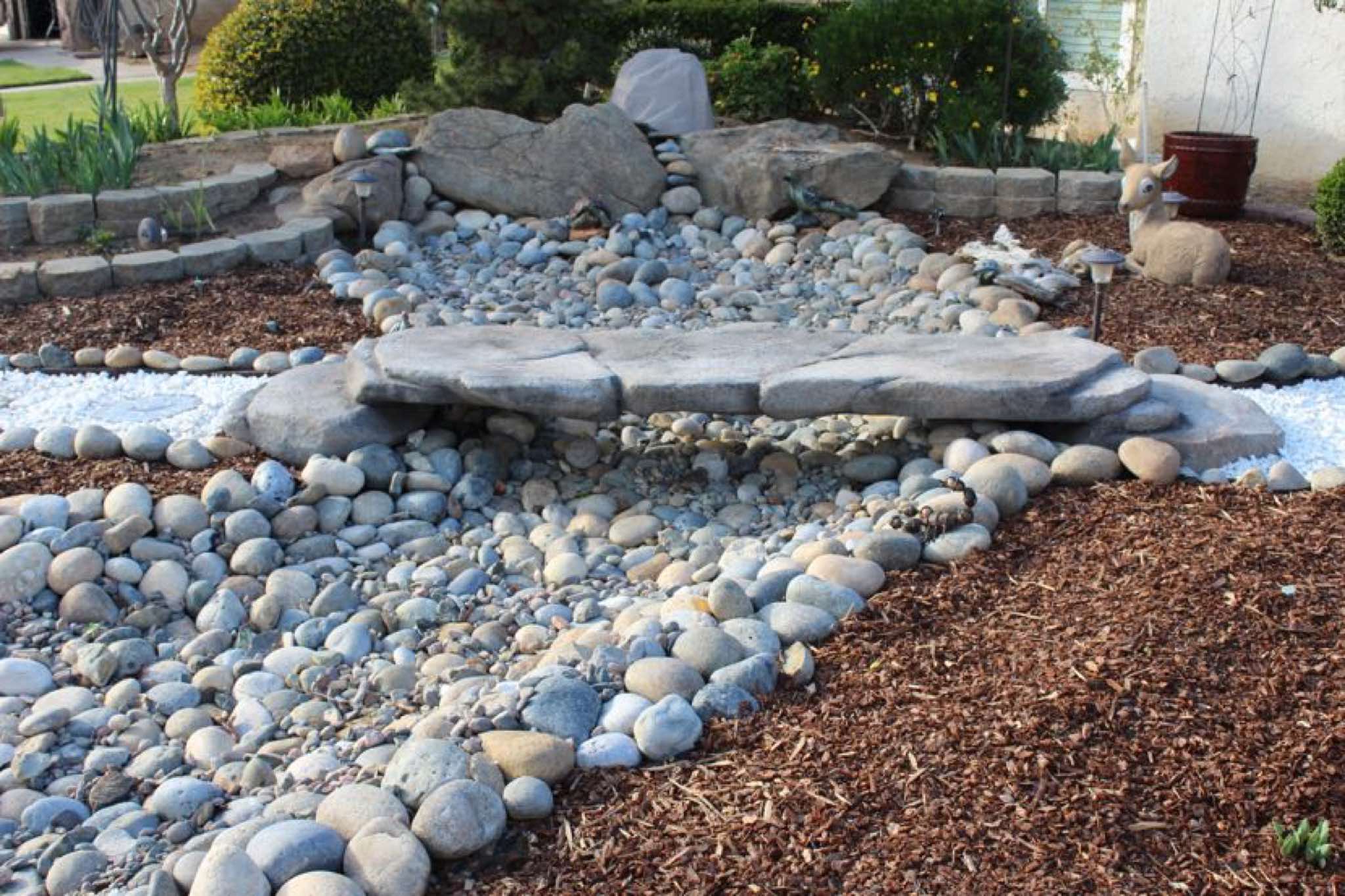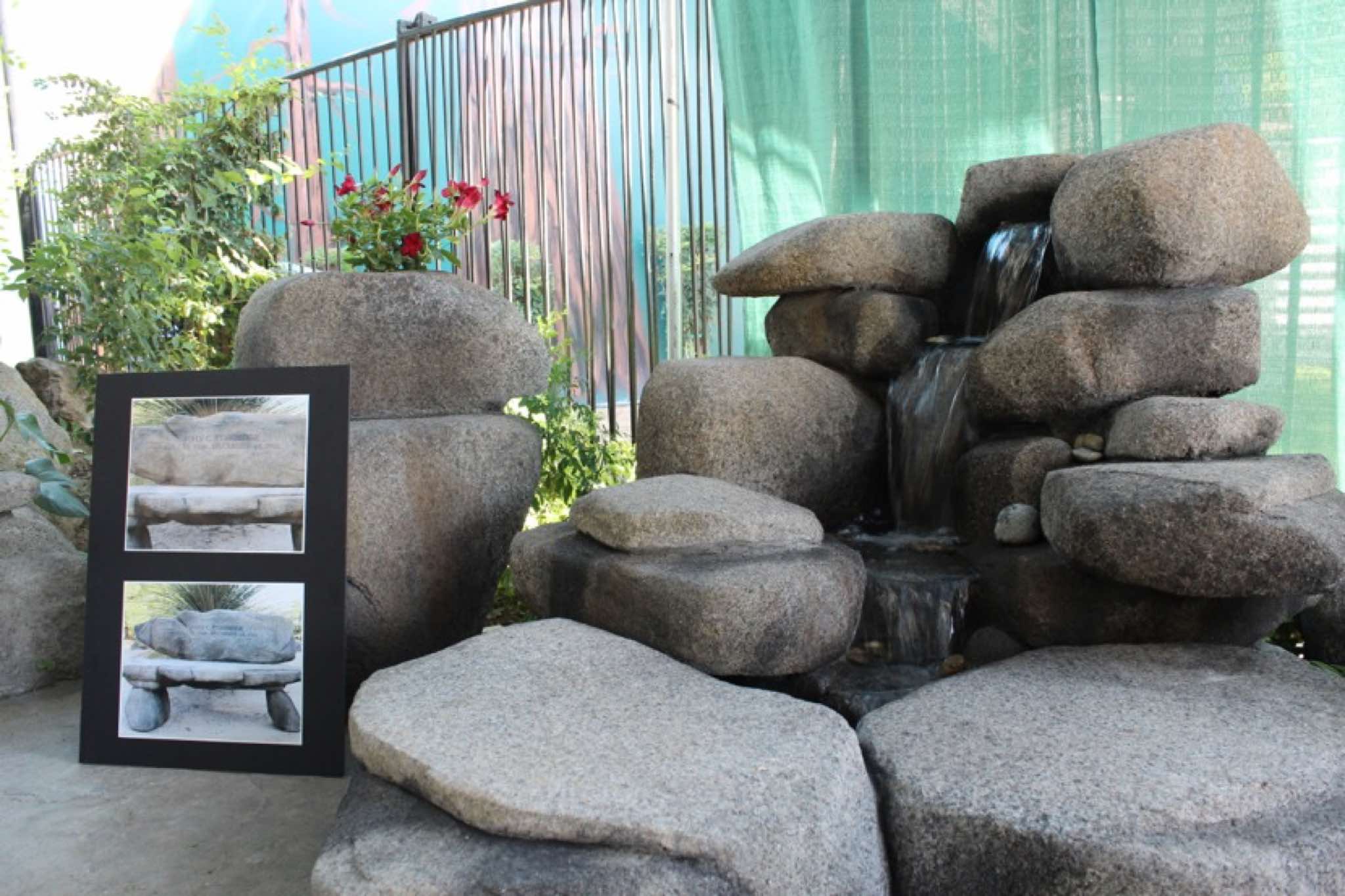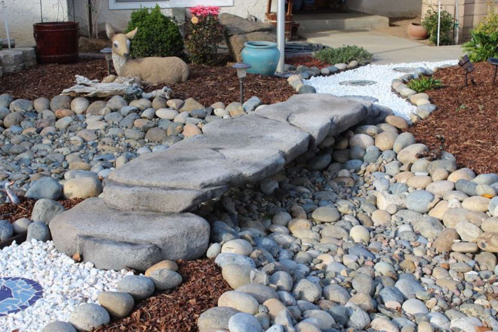 This pondless waterfall has over a 40ft long stream bed. At the end of the stream there is a small rock bridge to cross over to the other side where you can find a slate walkway to a bench next to the waterfall.This waterfall is on a remote system so it can be turned off and on with ease.