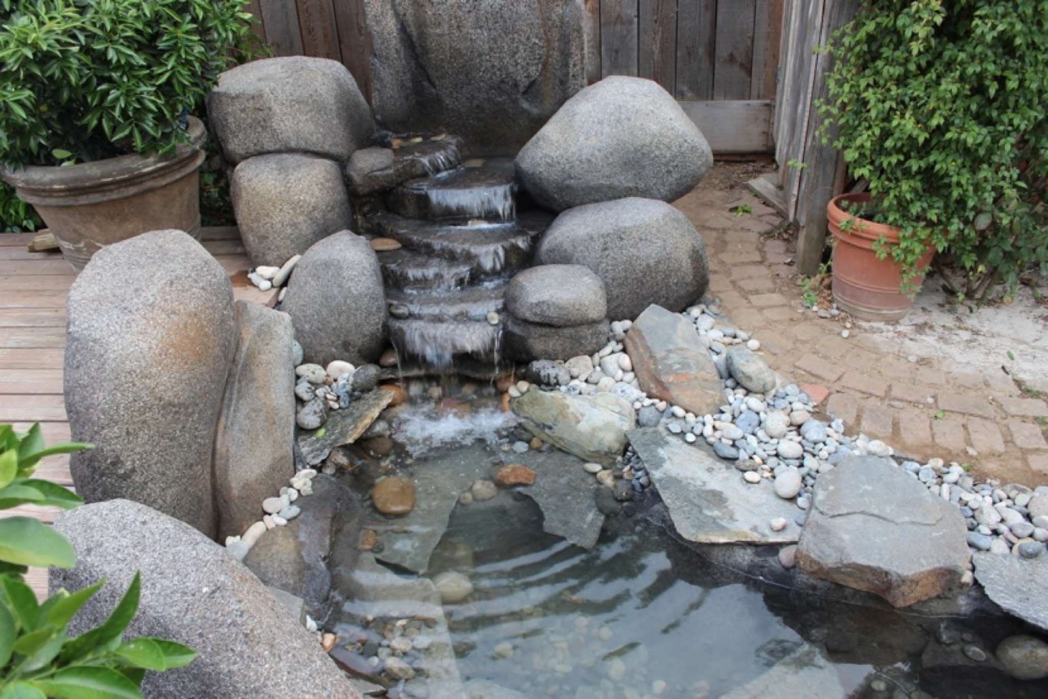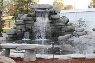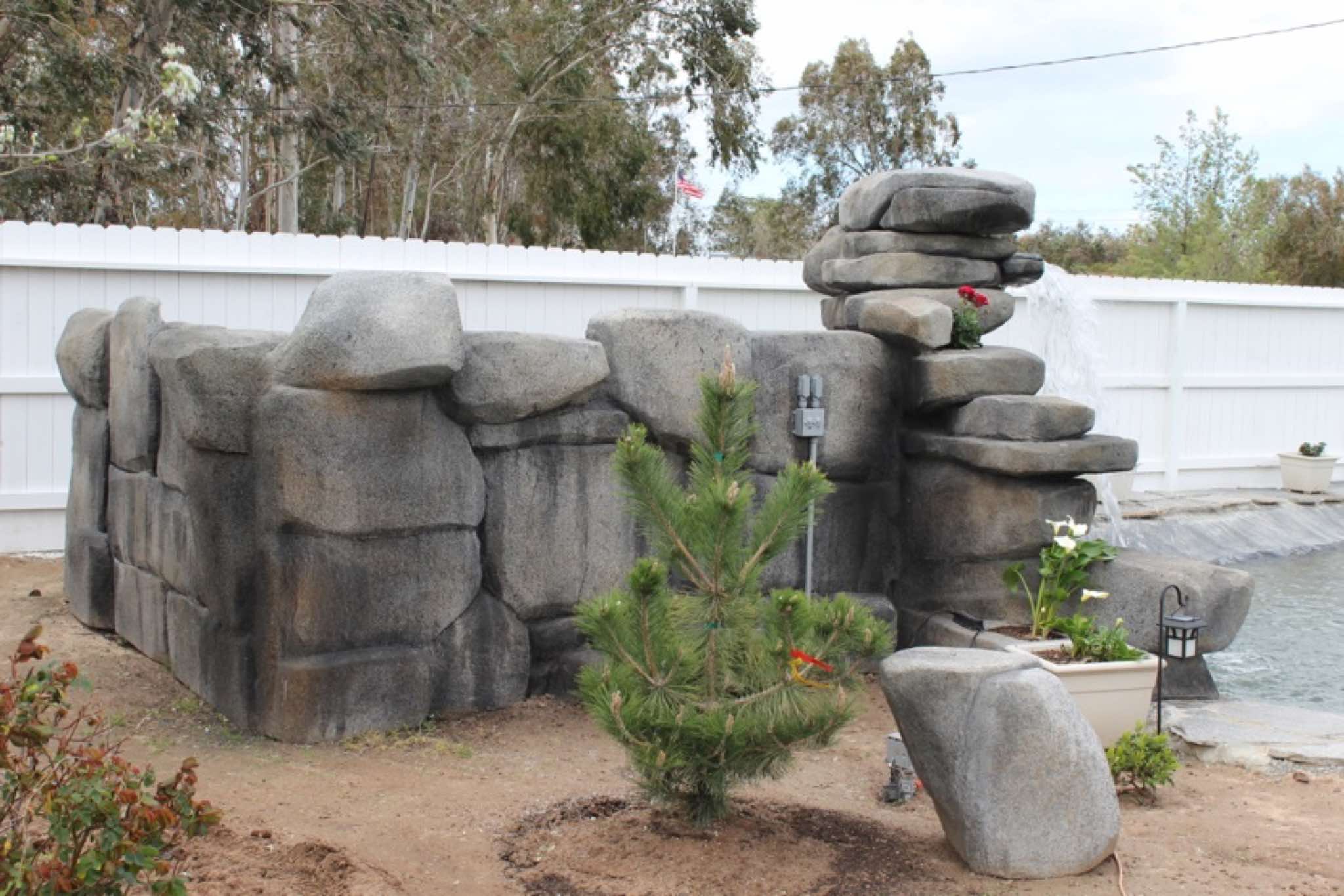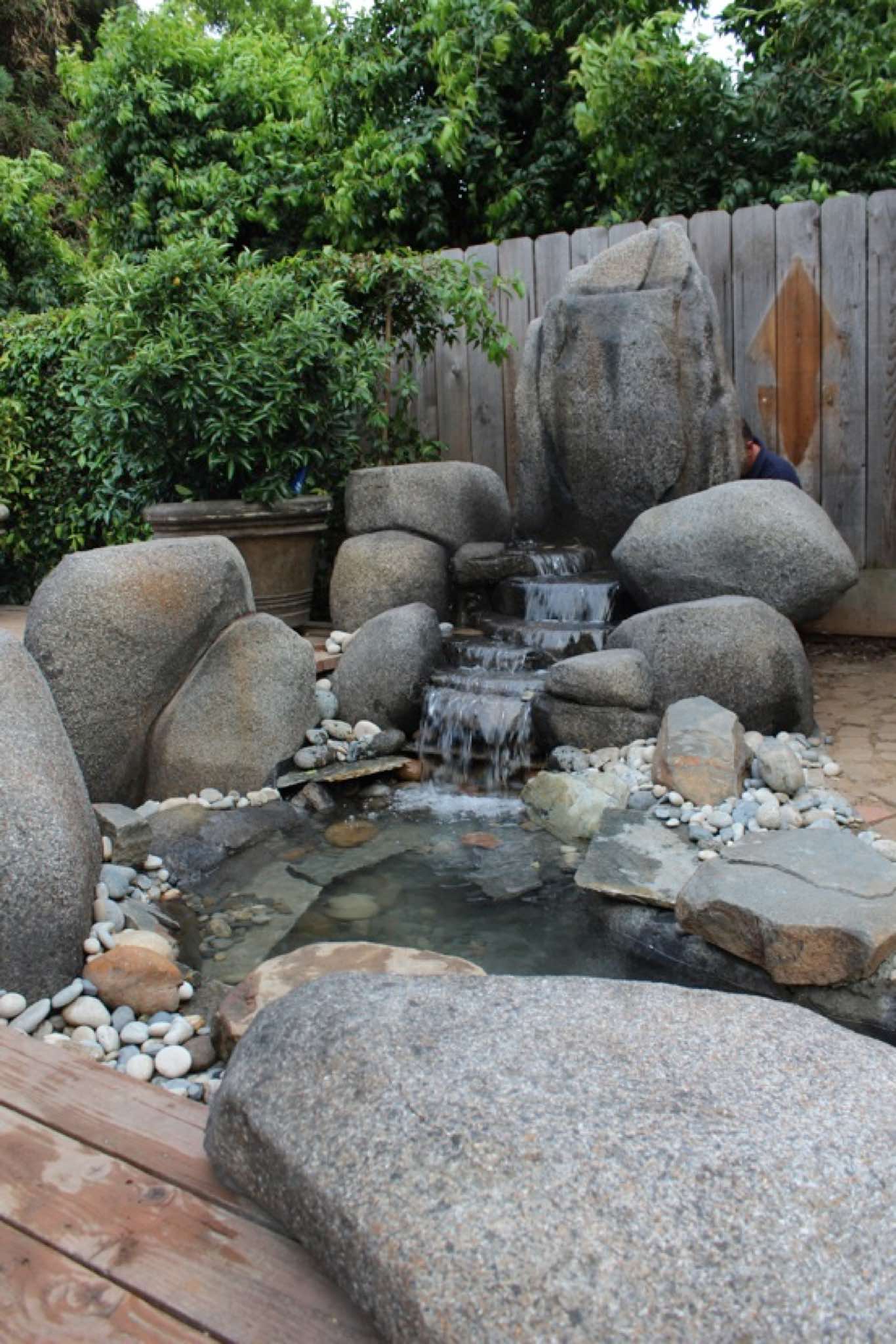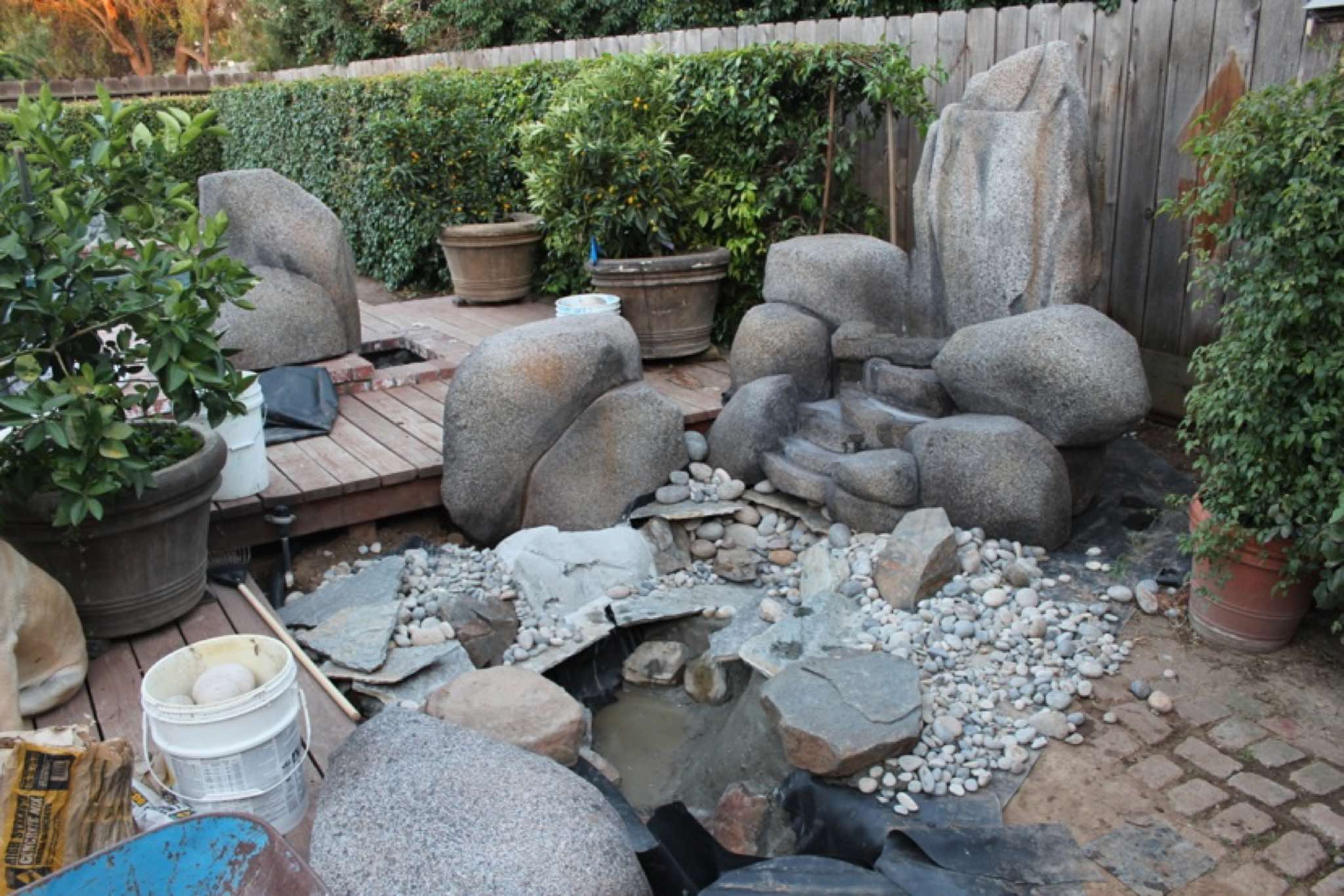 This small pond and waterfall was placed in a bare area next to a wooden deck and pool. The pond is perfect for a few fish or even just to hang you feet in. A combination of real rock and fake rocks were used during the installation. Photos of this installation are also included at the end of this gallery.