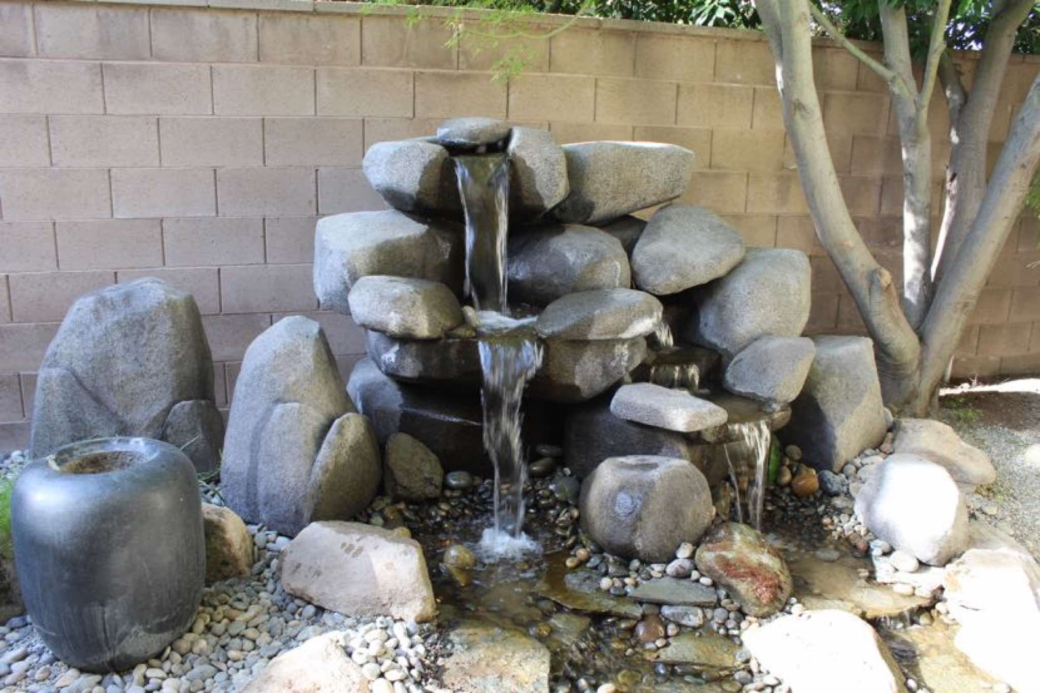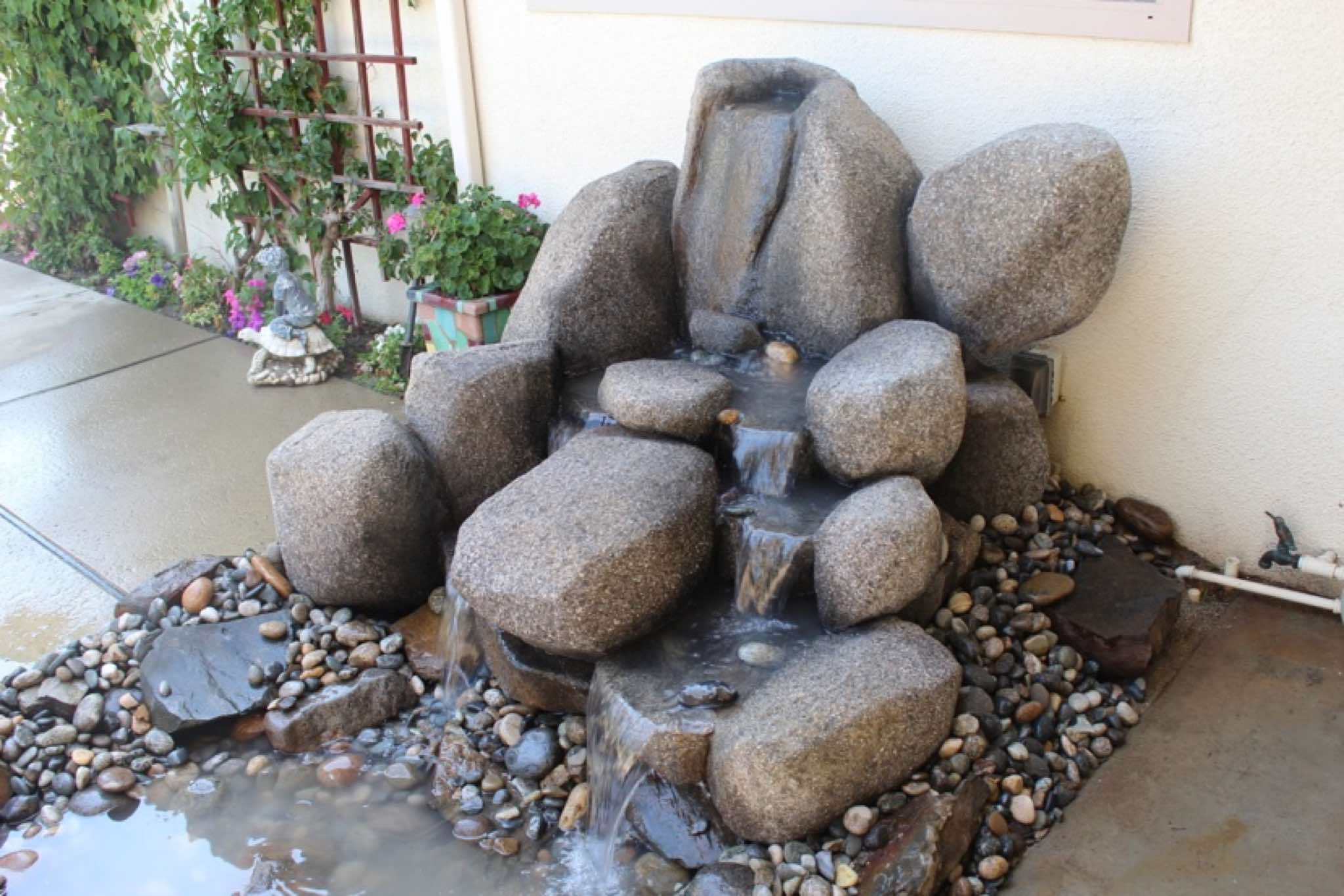 This is a small pondless waterfall with multiple water spillways. This is tucked away nicely into a beautiful garden area with alot of surrounding foliage. A pondless waterfall is a great option for areas that drop alot of leaves and other debris becuse the pump is protected in a vault and safe from possibly being clogged.